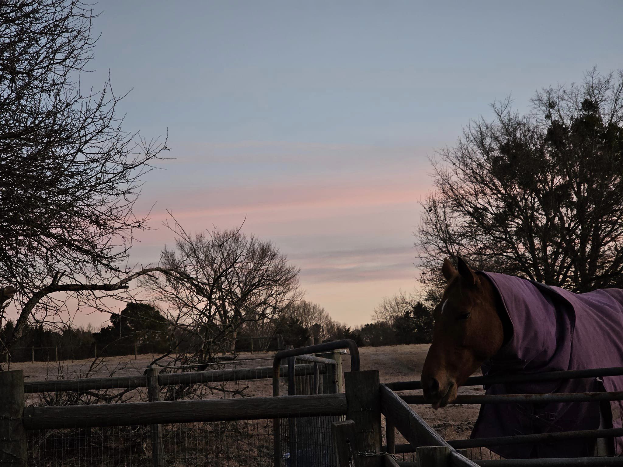 Well you know what mare... you might just have to be hot today darling! I pulled Dan out of the pasture and she sort of came closer, so I walked him back in the gate.. and then she took off again! Ok... fine... you chose poorly sister! I did text Mike to ask him if he would pull her clothes off when he got home if she cooperated. And never heard from him. Turns out.. she was in the far corner when he got home, so... poor girl stayed in her 100 gram with her 200 gram with hood on over it. Whoops!!! I don't know how warm it got here, but it was 58 degrees in Aiken and sunny.When we got home it was dark and chilly... but not too bad. I pulled her blankets off and she was dry, but you could tell she had been sweating. Again.. you chose that path love. Maybe tomorrow you won't be such a twit!